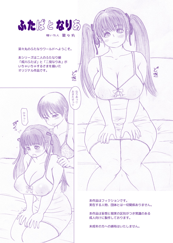 ←画像クリックでサンプル表示奈波屋のオリジナルふたなり作品「ふた×ふた」シリーズ。ふたなり娘"なりあ"と"ふたば"の物語。しゃぶったりしゃぶられたり挟んだり撫でられりし ながら射精してしまうふたなり娘のお話です。